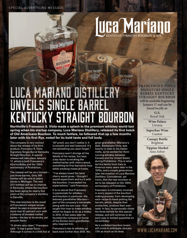 As he uncorked a bottle of the first batch of his Luca Mariano bourbon one afternoon last week, Northville's Francesco S. Viola was unwrapping a family treasure that was more than five years in the making. From the distinctive, eye-catching label aborning the uniquely-shaped bottle to the down-to-the-smallest-detail ingredients in the spirits inside, the newest addition to the world's bourbon market had Viola's vision and signature written all over it.